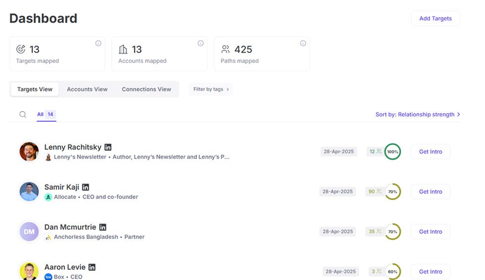 Built as an AI-powered agent, Draftboard identifies every viable path between a user and their prospects, ranks them by relationship strength, and makes outreach frictionless. Users can view results by individual person, by account, or by connection; personalize messages with dynamic templates; and soon connect email and calendar data for real-time intro opportunities.