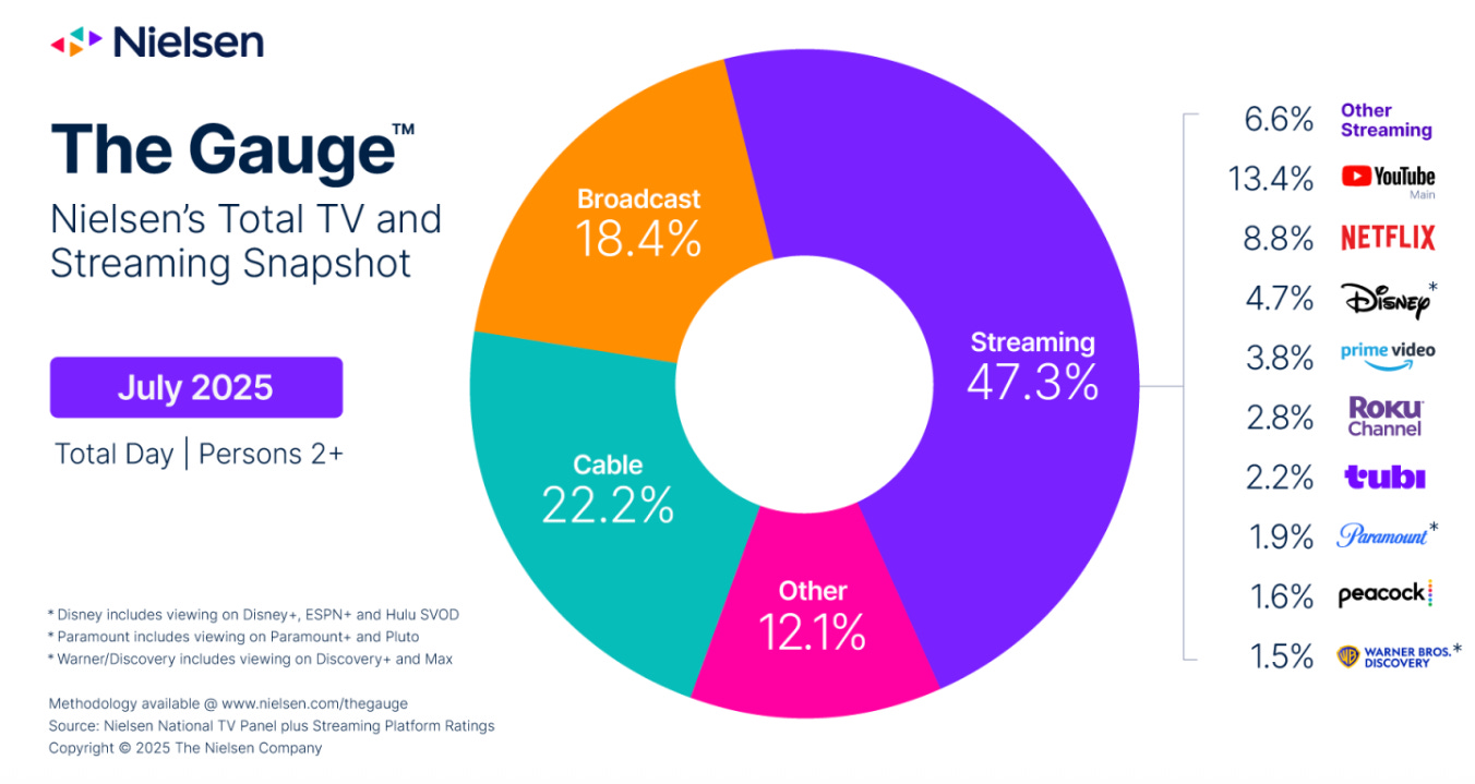 FAST channels, long associated with endless reruns of Matlock or Gilligan’s Island, are undergoing a serious glow-up. Platforms like Pluto, Tubi, and Roku Channel saw a 41% year-over-year rise in viewing, per Nielsen. Even the Super Bowl streamed on Tubi this year, drawing 15.5 million concurrent viewers. Nielsen says FAST channels now carry more programming made post 2020 than the global SVOD services. It’s unclear how much of that includes live news and sports coverage. The measurement firm’s July report out Tuesday, August 19, shows streaming taking almost half the entire TV viewing pie at 47.3 percent. Roku Channel one of the main platforms of FAST services grew its share by 7 percent versus last month (June.) YouTube is still the giant here.
